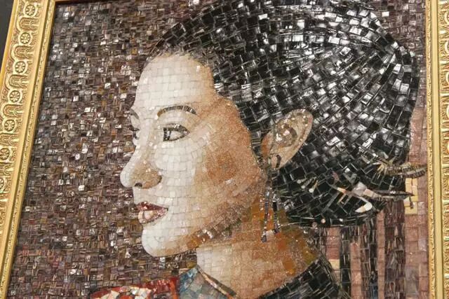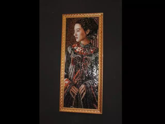 这是一个清宫的妃嫔的肖像,黑色的发髻、传神的面部表情……尤其是衣服的纹理变化,让人惊叹不已。或许,有一天,你甚至可以用装饰石材来“拍”一张你的照片或一些有纪念意义的照片,如婚纱照,如全家福。